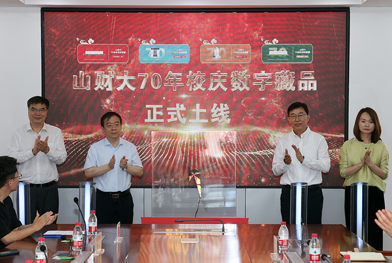 王邵军、赵忠秀、何长青、吴毅斐共同按下发布按钮,伴随着激昂的乐曲,炫酷的LED打出立体旋转的“山财大70年校庆数字藏品正式上线”字样,全场响起热烈掌声。