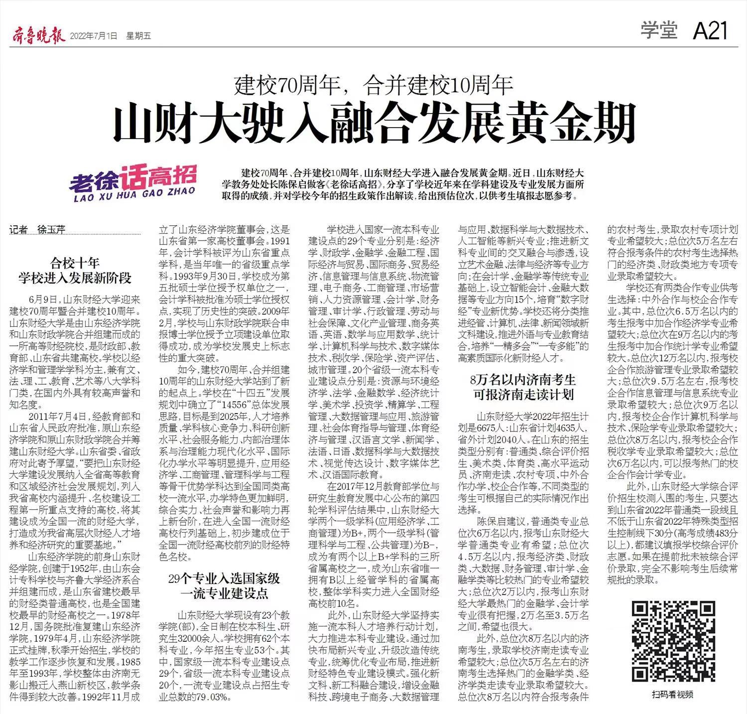 建校70周年、合并建校10周年,山东财经大学进入融合发展黄金期。近日,山东财经大学教务处处长陈保启做客《老徐话高招》,分享了学校近年来在学科建设及专业发展方面所取得的成绩,并对学校今年的招生政策作出解读,给出预估位次,以供考生填报志愿参考。