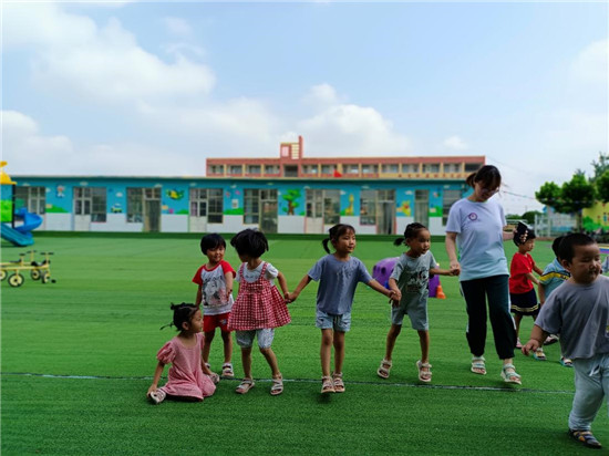 图为师生趣味游戏中,小朋友们齐心加油的场景 焦凤博 摄