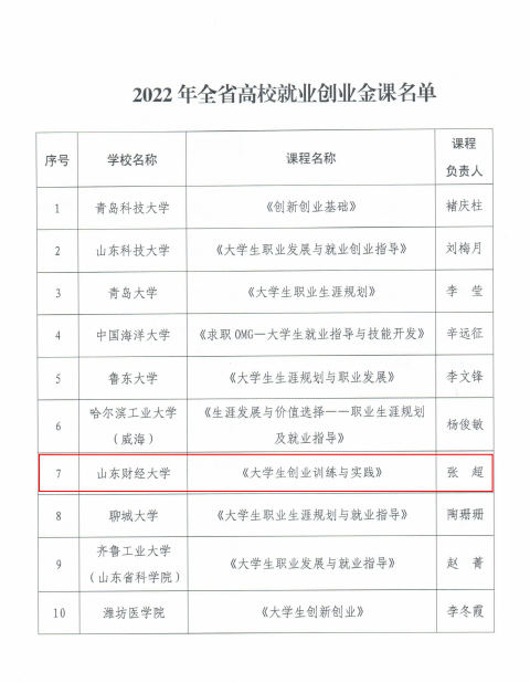 近日,山东省人力资源和社会保障厅发布《关于公布2022年全省高校就业创业金课和职业生涯咨询特色工作室的通知》,我校推荐申报的《大学生创业训练与实践》课程获评山东省高校就业创业金课,入选全省创业就业金课课程库。2022年全省高校就业创业金课评选工作由省人力资源社会保障厅负责组织实施,经过高校推荐、专家评审等流程,最终10门课程确定为全省高校就业创业金课。