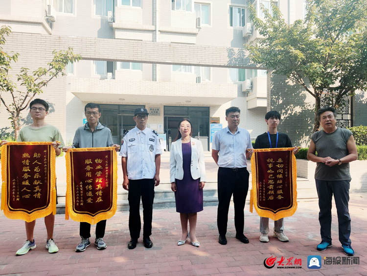 9月29日,一个普通的秋日下午,山东财经大学圣井校区五号公寓楼宿管王世涛像往常一样在值班室忙碌着,阳光透过玻璃窗,照在他清瘦的背脊上。突然,屋外一阵喧哗,大门被推开了,六名男生举着三面锦旗走了进来,一起来的还有学校党委学生工作部副部长孙丽华、明英物业经理韩明明和圣井公寓管理科科长薛鹏。