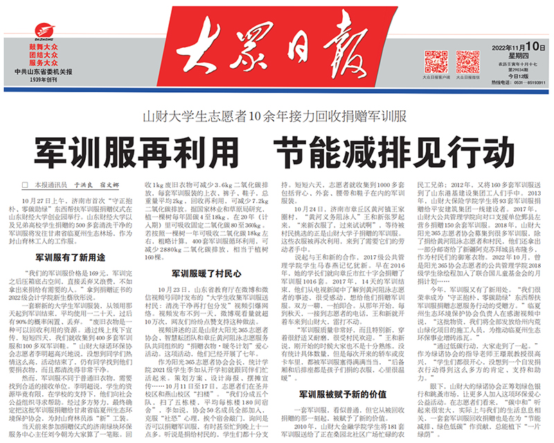 2010年,山财大金融学院学生将181套军训服送给了正在桑园北社区广场忙碌的农民工兄弟;2012年,又将160多套军训服送到了山东港基建设集团工人们手中。2013年,山财大保险学院学生将93套军训服捐赠给平安建筑集团一线建设者。2017年,山财大公共管理学院向对口支援单位鄄城县左营乡捐赠150余套军训服。2018年,山财大阳光365志愿者协会募集到很多军训服,除了捐给黄河阻泳志愿者和村民,他们还拿出一部分邮寄给了新疆阿克苏拜城县布隆乡,作为村民们的御寒衣物。2022年10月,曾是阳光365协会志愿者的公共管理学院2018级学生徐绘程加入了联合国儿童基金会的月捐计划……