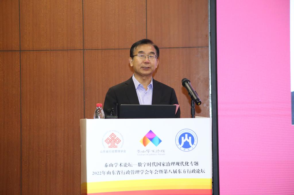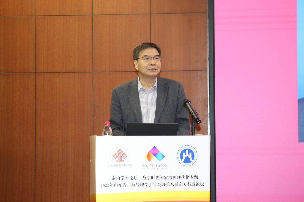 上海交通大学国际与公共事务学院院长吴建南教授,哈尔滨工业大学《公共管理学报》主编米加宁教授,华中科技大学公共管理学院徐晓林教授,山东省政府参事、山东省行政管理学会会长张述存研究员,山东社会科学院马克思主义研究院院长、山东省行政管理学会秘书长冯锋研究员,山东师范大学公共管理学院曲延春教授,山东财经大学公共管理与法学学部部长、山东省行政管理学会副会长张红凤教授分别围绕“践行城市善治:以人民为中心的数字化转型”“算力驱动的国家治理能力现代化”“数字政府建设的安全治理体系研究”“推进山东省数字政府建设的几点思考”“大数据提升政府决策水平的内在逻辑”“农村共同富裕目标下的第三次分配:问题检视与推进路径”“数字时代食品安全治理现代化”做了主题发言。山东大学校长助理、本科生院院长、山东省行政管理学会副会长曹现强教授,山东财经大学公共管理学院院长、山东省行政管理学会副秘书长贾海彦教授先后主持大会主题发言。
