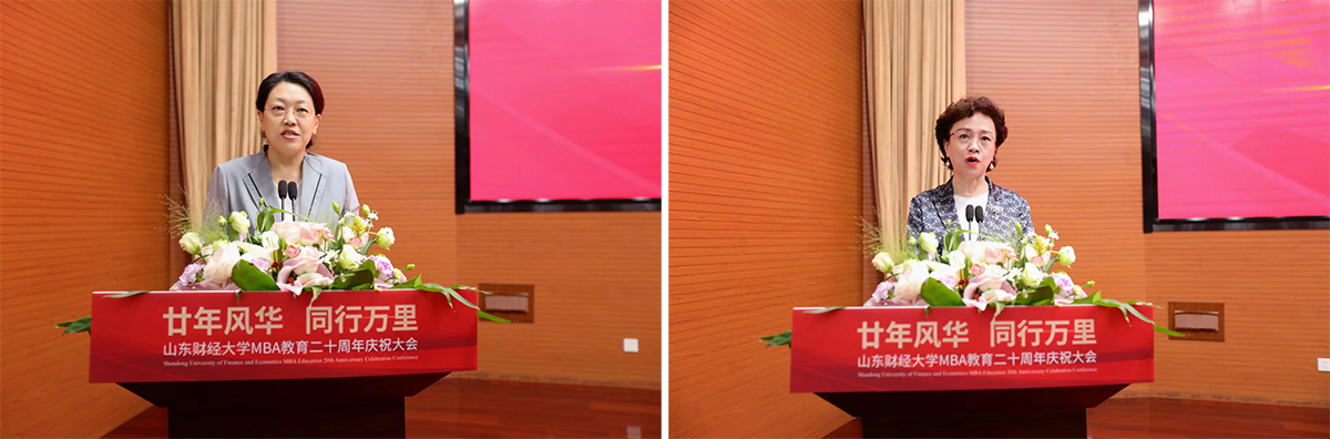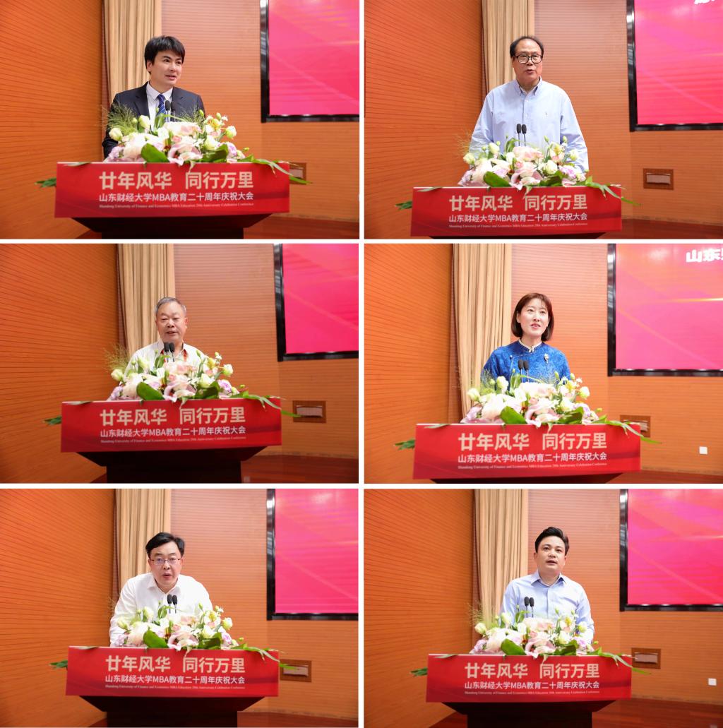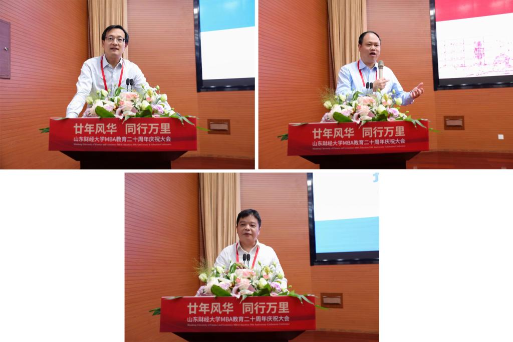 中央财经大学商学院院长林嵩在致辞中代表兄弟院校向学校MBA教育办学20周年表示祝贺,希望携手开创MBA教育工作新局面,为高等教育强国建设贡献新力量。山东建筑大学原副校长、原山东经济学院MBA中心主任吴彬,山东财经大学原MBA中心主任曹洪军在致辞中表示,作为学校MBA教育的开创者、建设者,希望山财大MBA教育躬耕弘道、凝练特色,培养更多具有鲁商精神的卓越企业家和管理者。校友代表丁召华、教师代表王璟珉、在校生代表陈广平,表达了作为MBA一分子的使命感、责任感和自豪感和对未来发展的美好祝愿。