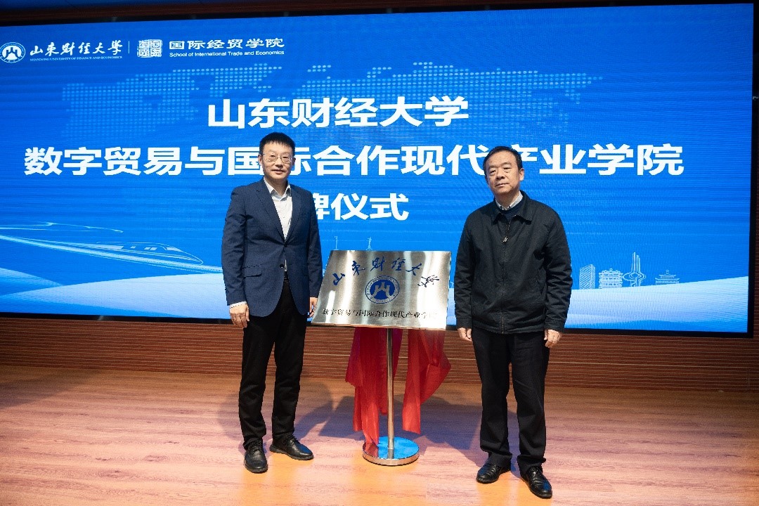 会上,王邵军与中国山东国际经济技术有限公司总经理蔡锟共同为山东财经大学数字贸易与国际合作现代产业学院揭牌。